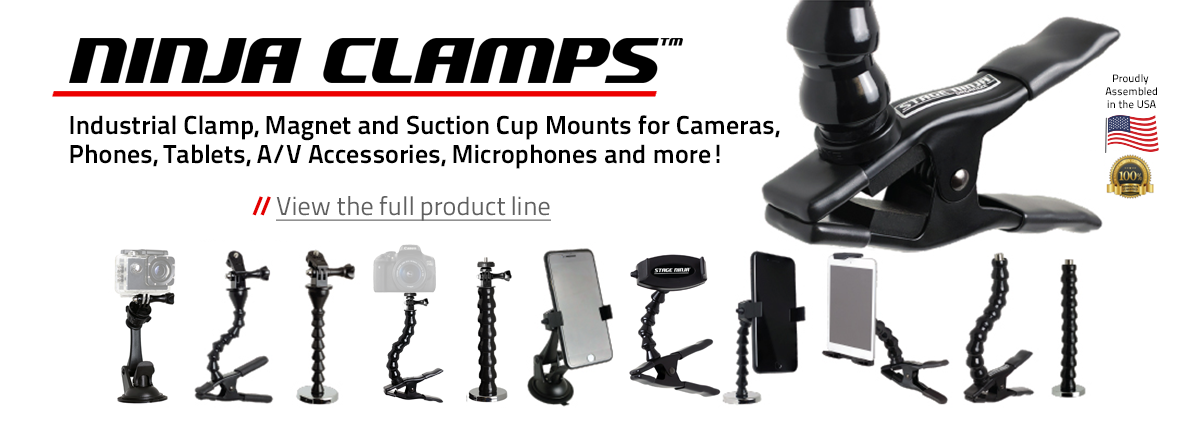 Stage Ninja® manufactures high quality mounts for microphones, phones, tablets, cameras, action cameras, and more.