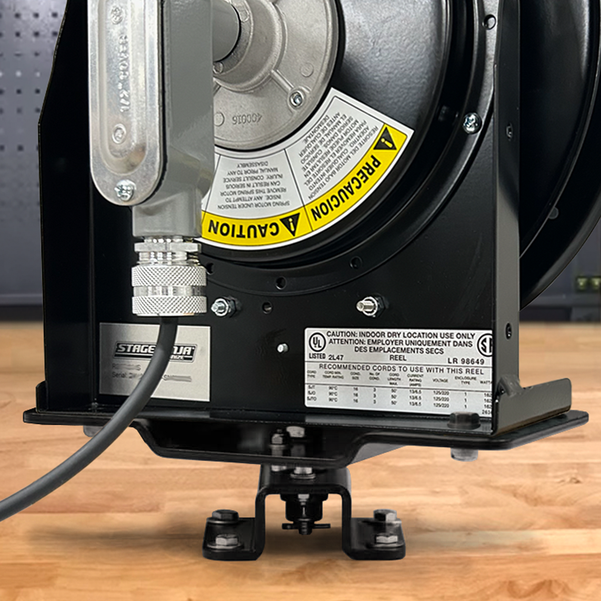 Click PDF Icon for Spec Sheet Use if cables are pulled at more than 45°. The 340° Pivot Base can be mounted overhead or on a flat surface like a work table to allowing more flexibilty to deploy cable. Compatible with XLR-50-CT, 4XLR-35-CT, DMX-50-CT, HDSDI-50-CT, CAT6-50-S, CAT6-50-CT, 2CAT6-30-S, 2CAT6-30-CT, PWRD-45-S. NOT for wall mounting (select BRK-12-SWG) or non-level surface. Reel must be mounted on a horizontal surface either overhead, or on a table, floor, etc.