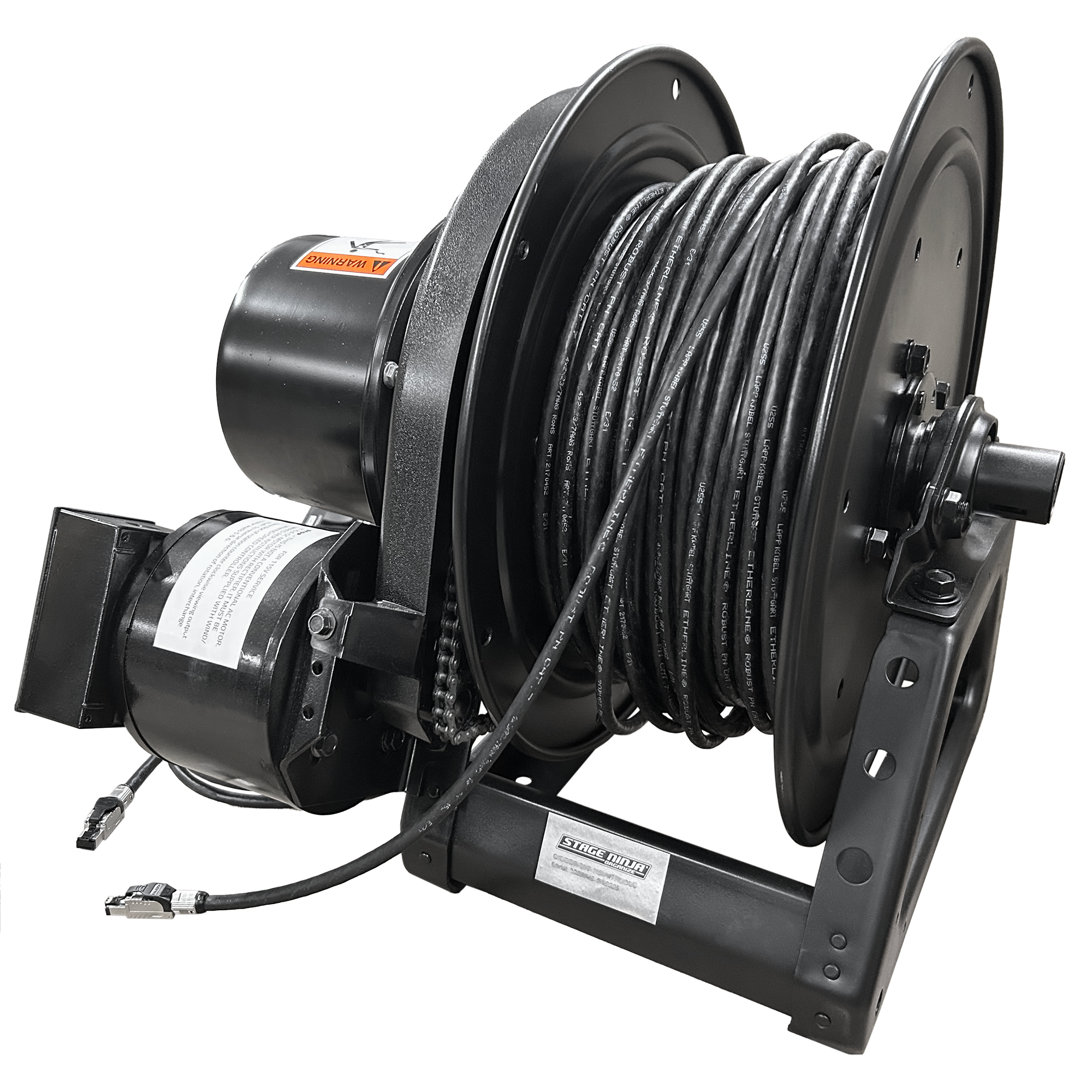 Click PDF Icon for Spec Sheet Perfect for large spaces like aircraft hangars, or rapid setup/tear down needs like mobile AV trailers, first responder mass deployment bases, law enforcement mobile command centers and more, Stage Ninja’s motorized 300-ft (91.44 m)CAT6 reel allows quick network deployment to hard to reach locations. No more unwinding/untangling of extra long cables; tidy, rapid rewind when your finished—so you’re ready for next time. Contact sales department to specify 12V or 115V motor.