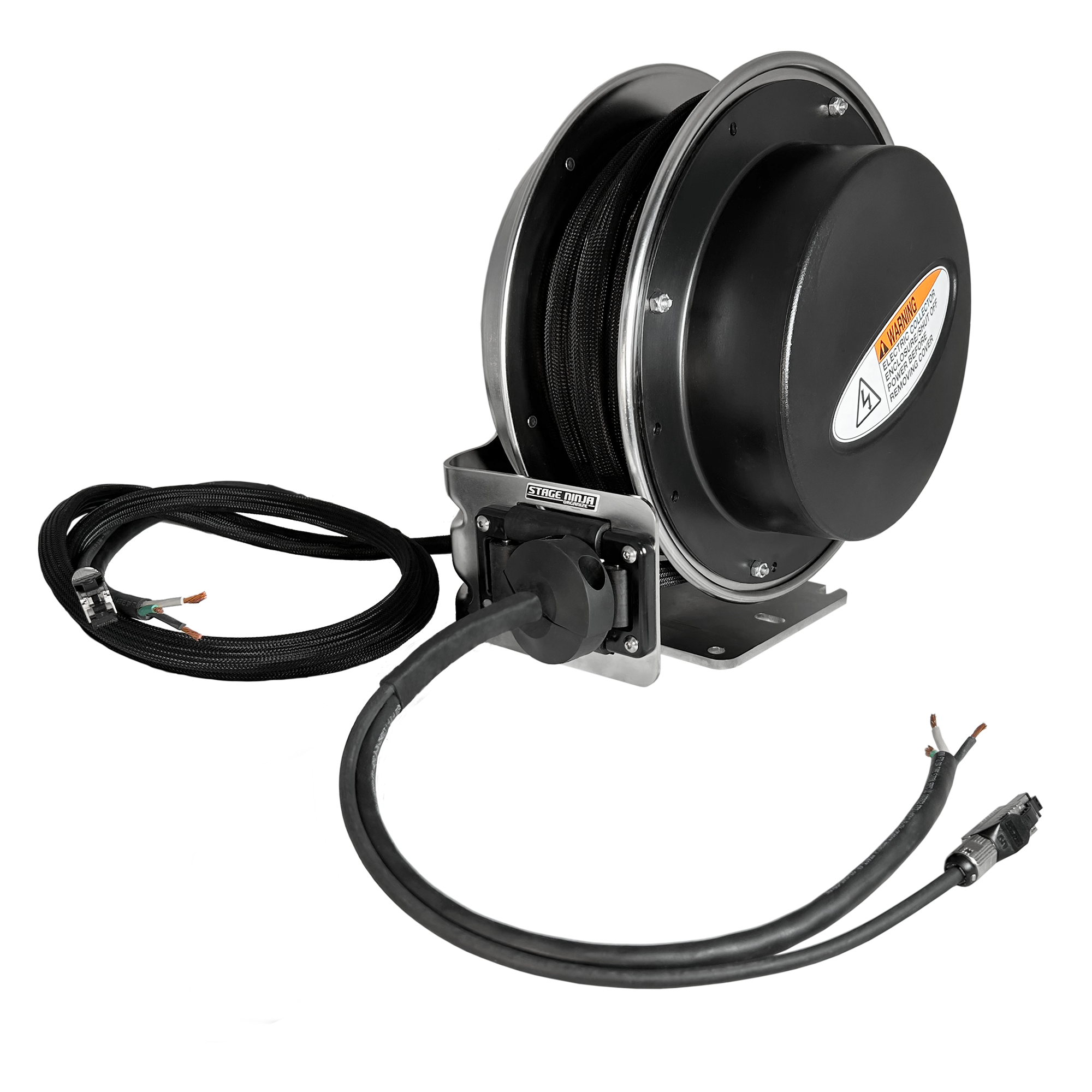 Click PDF Icon for Spec Sheet Power and ethernet in one compact retractable cable reel! One 20A circuit and one gigabit ethernet cable are sleeved together with fanouts to individual cables for hookup in Stage Ninja’s compact stainless steel retractable cable reel platform. American-made, industrial-grade, and engineered for commercial and professional use, this platform allows customized spring drives optimized for cable types and weights.
